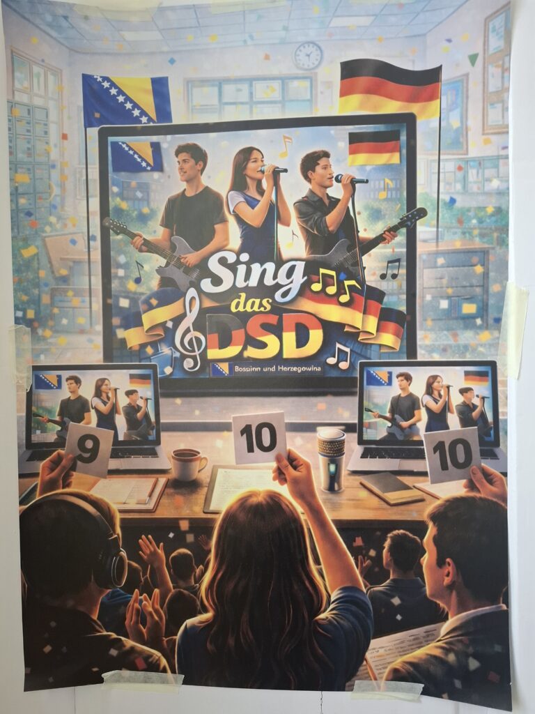 U finalu kreativnog muzičkog takmičenja pod nazivom “Sing das DSD” održanog pod motom “Mediji” 15.4.2026. u Prvoj gimnaziji u Sarajevu učestvovale su četiri učenice naše škole koje pohađaju napredni program njemačkog jezika. Maturantkinje Ilhana Šerifović, Katarina Janjatović i Sara Manojlović predstavile su se spotom i pjesmom “Nur noch kurz dein Bild sehen”, a Emilija Tanasić, učenica prvog razreda, sa još šest učenika drugih škola bila je punopravni član učeničkog žirija. Profesorica njemačkog jezika Tanja Pavlović predvodila je ovu malu delegaciju.